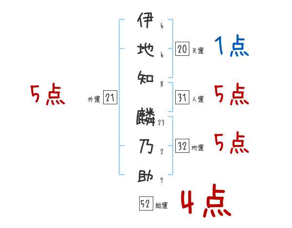 地運![]() | 伊地知麟乃助さんの地運は32画の5つ星!柔軟性があり成功する。チャンスが多く金運が良い。 個性を表す基礎的な運勢です。性格形成や対人関係、行動力など家庭環境に影響されます。主に誕生してから20歳くらいまでの若年期の運勢を表します。 |