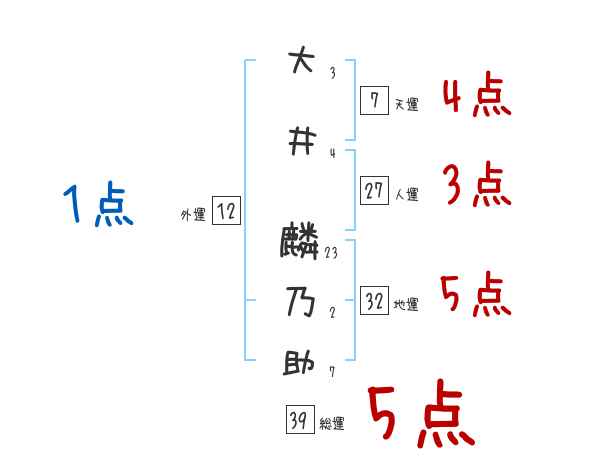 地運![]() | 大井麟乃助さんの地運は32画の5つ星!柔軟性があり成功する。チャンスが多く金運が良い。 個性を表す基礎的な運勢です。性格形成や対人関係、行動力など家庭環境に影響されます。主に誕生してから20歳くらいまでの若年期の運勢を表します。 |