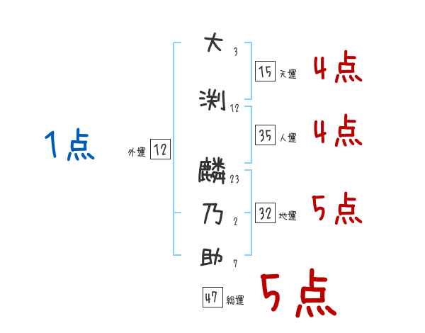 地運![]() | 大渕麟乃助さんの地運は32画の5つ星!柔軟性があり成功する。チャンスが多く金運が良い。 個性を表す基礎的な運勢です。性格形成や対人関係、行動力など家庭環境に影響されます。主に誕生してから20歳くらいまでの若年期の運勢を表します。 |