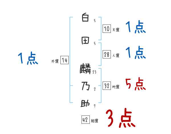 地運![]() | 白田麟乃助さんの地運は32画の5つ星!柔軟性があり成功する。チャンスが多く金運が良い。 個性を表す基礎的な運勢です。性格形成や対人関係、行動力など家庭環境に影響されます。主に誕生してから20歳くらいまでの若年期の運勢を表します。 |