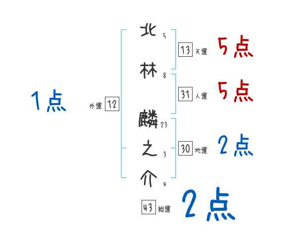 総運![]() | 北林麟之介さんの総運は43画の2つ星!頑固な性格で独立心が強いかも。やや非現実的で浪費に注意しましょう。 あなたの人生を表す1番重要な運勢です。生涯を通じて影響する総合運となり、主に50歳以降の晩年期に影響を及ぼします。 |