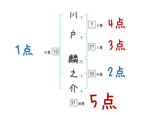天運![]() | 川戸麟之介さんの天運は7画の4つ星!強い意志や信念を持ち独立心が強い。自立する。 家系が持つ宿命的な運勢を表します。祖先から受け継いだ苗字ですので自分の力が及びません。家柄を象徴します。 |