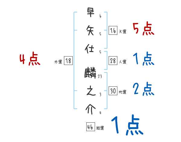 外運![]() | 早矢仕麟之介さんの外運は18画の4つ星!情熱的で剛気。忍耐力があり信頼される。 生活面を象徴する運勢です。外部から受ける影響力を表し、結婚運、家庭運や職場、環境への順応性を表します。 |
