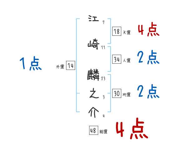 天運![]() | 江崎麟之介さんの天運は18画の4つ星!情熱的で剛気。忍耐力があり信頼される。 家系が持つ宿命的な運勢を表します。祖先から受け継いだ苗字ですので自分の力が及びません。家柄を象徴します。 |