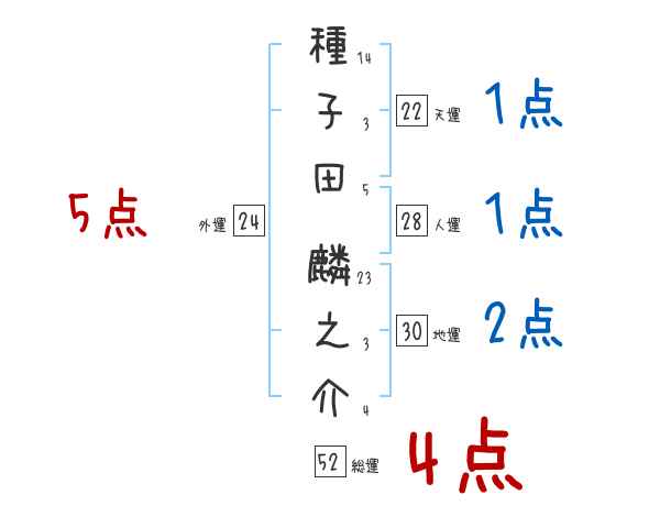 外運![]() | 種子田麟之介さんの外運は24画の5つ星!家庭運が良く順調な人生。金運にも恵まれる。 生活面を象徴する運勢です。外部から受ける影響力を表し、結婚運、家庭運や職場、環境への順応性を表します。 |