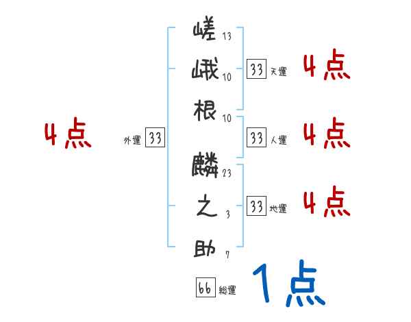 地運![]() | 嵯峨根麟之助さんの地運は33画の4つ星!権力志向でプライドが高い。勇気があり運を切り開き成功する。 個性を表す基礎的な運勢です。性格形成や対人関係、行動力など家庭環境に影響されます。主に誕生してから20歳くらいまでの若年期の運勢を表します。 |
