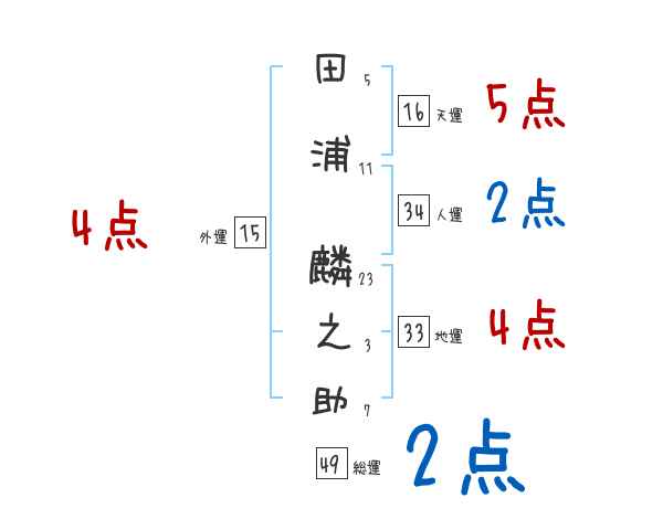 地運![]() | 田浦麟之助さんの地運は33画の4つ星!権力志向でプライドが高い。勇気があり運を切り開き成功する。 個性を表す基礎的な運勢です。性格形成や対人関係、行動力など家庭環境に影響されます。主に誕生してから20歳くらいまでの若年期の運勢を表します。 |