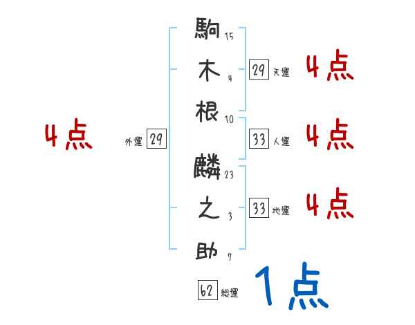 天運![]() | 駒木根麟之助さんの天運は29画の4つ星!完全主義で才能がある。厳格な心の持ち主。 家系が持つ宿命的な運勢を表します。祖先から受け継いだ苗字ですので自分の力が及びません。家柄を象徴します。 |