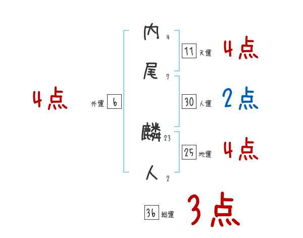 総運![]() | 内尾麟人さんの総運は36画の3つ星!先見性が豊かです。多少神経質で苦労することも。 あなたの人生を表す1番重要な運勢です。生涯を通じて影響する総合運となり、主に50歳以降の晩年期に影響を及ぼします。 |