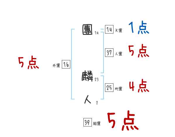 外運![]() | 團麟人さんの外運は16画の5つ星!人望が厚く大きく発展する。逆転成功が見える。 生活面を象徴する運勢です。外部から受ける影響力を表し、結婚運、家庭運や職場、環境への順応性を表します。 |