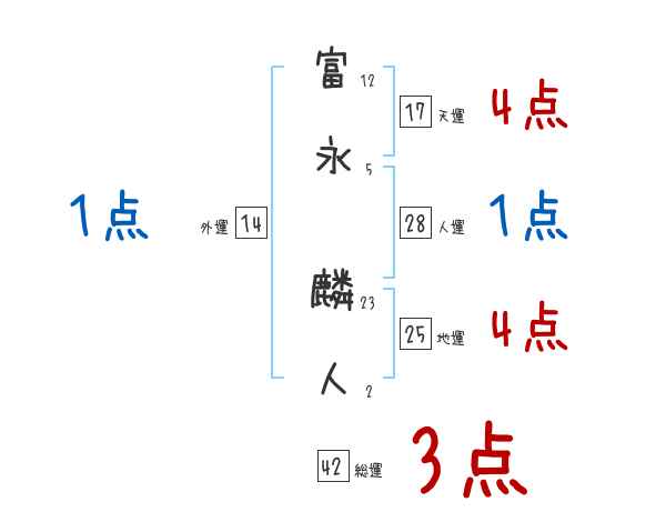 総運![]() | 富永麟人さんの総運は42画の3つ星!病気に注意。多芸であるが消極的でおとなしい。 あなたの人生を表す1番重要な運勢です。生涯を通じて影響する総合運となり、主に50歳以降の晩年期に影響を及ぼします。 |