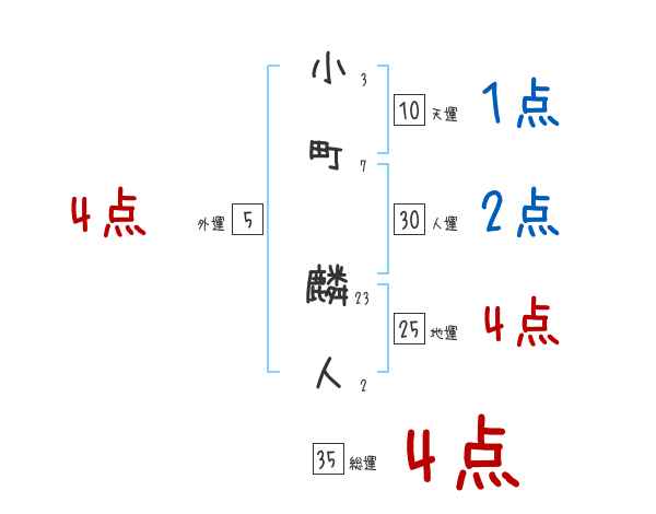 天運![]() | 小町麟人さんの天運は10画の1つ星!不安を感じやすい傾向。ストレスを抱えないように注意しましょう。 家系が持つ宿命的な運勢を表します。祖先から受け継いだ苗字ですので自分の力が及びません。家柄を象徴します。 |