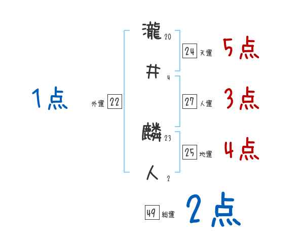 天運![]() | 瀧井麟人さんの天運は24画の5つ星!家庭運が良く順調な人生。金運にも恵まれる。 家系が持つ宿命的な運勢を表します。祖先から受け継いだ苗字ですので自分の力が及びません。家柄を象徴します。 |