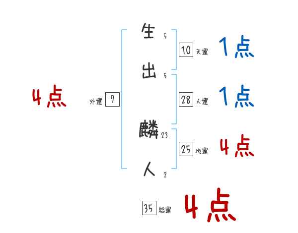 外運![]() | 生出麟人さんの外運は7画の4つ星!強い意志や信念を持ち独立心が強い。自立する。 生活面を象徴する運勢です。外部から受ける影響力を表し、結婚運、家庭運や職場、環境への順応性を表します。 |