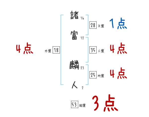 天運![]() | 諸富麟人さんの天運は28画の1つ星!家庭環境に注意。スポーツで活躍できる能力があるかも。 家系が持つ宿命的な運勢を表します。祖先から受け継いだ苗字ですので自分の力が及びません。家柄を象徴します。 |