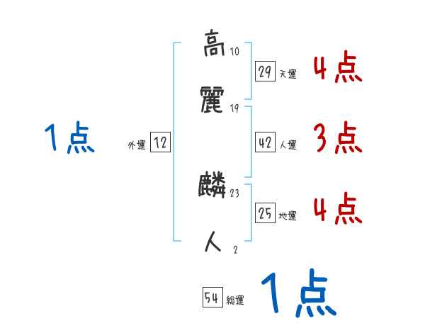 天運![]() | 高麗麟人さんの天運は29画の4つ星!完全主義で才能がある。厳格な心の持ち主。 家系が持つ宿命的な運勢を表します。祖先から受け継いだ苗字ですので自分の力が及びません。家柄を象徴します。 |