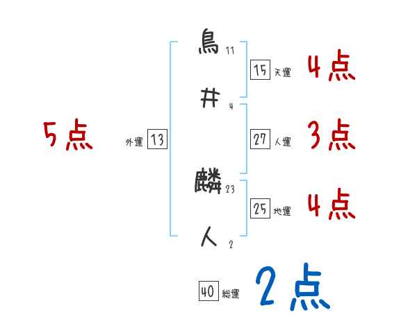 天運![]() | 鳥井麟人さんの天運は15画の4つ星!人徳があり出世する。順調に物事を進め円満な人生。 家系が持つ宿命的な運勢を表します。祖先から受け継いだ苗字ですので自分の力が及びません。家柄を象徴します。 |