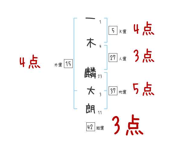 天運![]() | 一木麟大朗さんの天運は5画の4つ星!健康で安泰。協調性に優れ、財産に恵まれる。 家系が持つ宿命的な運勢を表します。祖先から受け継いだ苗字ですので自分の力が及びません。家柄を象徴します。 |