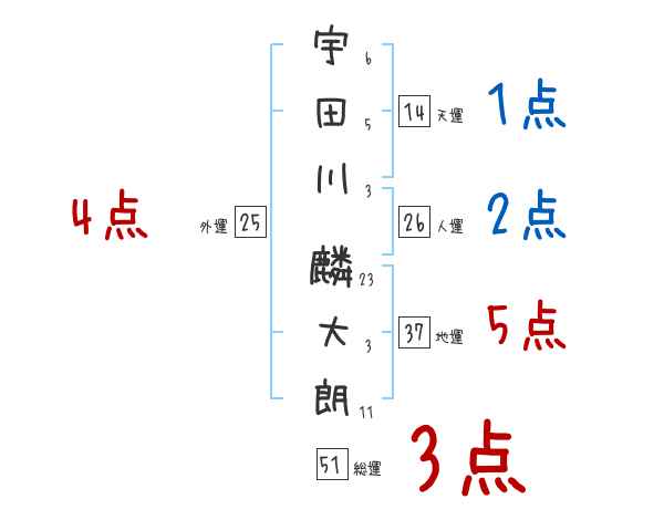 天運![]() | 宇田川麟大朗さんの天運は14画の1つ星!人に対して優しいがストレスを溜め込みがち。人間関係のトラブルを避けるよう気をつけましょう。 家系が持つ宿命的な運勢を表します。祖先から受け継いだ苗字ですので自分の力が及びません。家柄を象徴します。 |