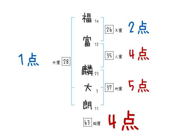 天運![]() | 福富麟大朗さんの天運は26画の2つ星!波瀾万丈かも。信頼できる人を大事にしましょう。 家系が持つ宿命的な運勢を表します。祖先から受け継いだ苗字ですので自分の力が及びません。家柄を象徴します。 |