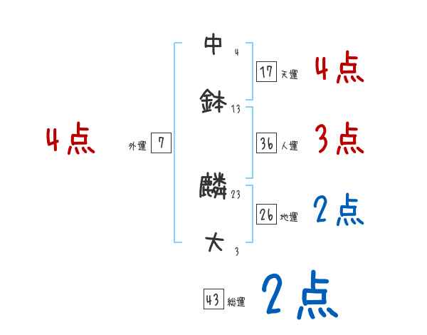 天運![]() | 中鉢麟大さんの天運は17画の4つ星!積極的な行動力。地位を気づき財産を手に入れる。純粋な心と直感力。 家系が持つ宿命的な運勢を表します。祖先から受け継いだ苗字ですので自分の力が及びません。家柄を象徴します。 |