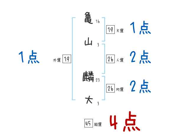 外運![]() | 亀山麟大さんの外運は19画の1つ星!優れた才能を持ちますが、協調性が足りないことも。周りの人と協力する事を意識しましょう。 生活面を象徴する運勢です。外部から受ける影響力を表し、結婚運、家庭運や職場、環境への順応性を表します。 |