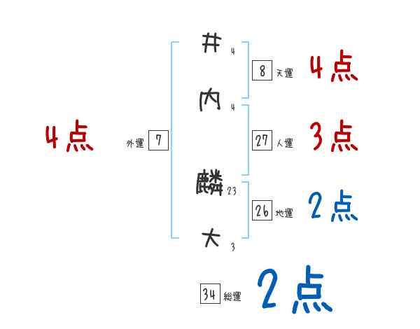 総運![]() | 井内麟大さんの総運は34画の2つ星!独創性に優れるが、自尊心が強く災難に注意しましょう。 あなたの人生を表す1番重要な運勢です。生涯を通じて影響する総合運となり、主に50歳以降の晩年期に影響を及ぼします。 |