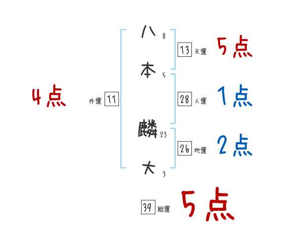 天運![]() | 八本麟大さんの天運は13画の5つ星!才能に恵まれ人気がある。名声を手に入れる。円満な人生。 家系が持つ宿命的な運勢を表します。祖先から受け継いだ苗字ですので自分の力が及びません。家柄を象徴します。 |
