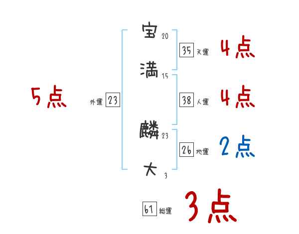 天運![]() | 宝満麟大さんの天運は35画の4つ星!温厚な性格で感受性が高い。穏和な性格で人望が厚い。 家系が持つ宿命的な運勢を表します。祖先から受け継いだ苗字ですので自分の力が及びません。家柄を象徴します。 |