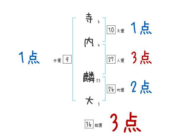 天運![]() | 寺内麟大さんの天運は10画の1つ星!不安を感じやすい傾向。ストレスを抱えないように注意しましょう。 家系が持つ宿命的な運勢を表します。祖先から受け継いだ苗字ですので自分の力が及びません。家柄を象徴します。 |