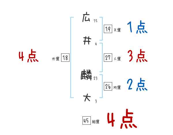 天運![]() | 広井麟大さんの天運は19画の1つ星!優れた才能を持ちますが、協調性が足りないことも。周りの人と協力する事を意識しましょう。 家系が持つ宿命的な運勢を表します。祖先から受け継いだ苗字ですので自分の力が及びません。家柄を象徴します。 |