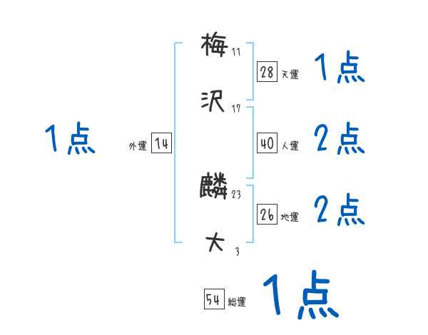 天運![]() | 梅沢麟大さんの天運は28画の1つ星!家庭環境に注意。スポーツで活躍できる能力があるかも。 家系が持つ宿命的な運勢を表します。祖先から受け継いだ苗字ですので自分の力が及びません。家柄を象徴します。 |