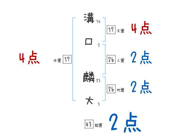 天運![]() | 溝口麟大さんの天運は17画の4つ星!積極的な行動力。地位を気づき財産を手に入れる。純粋な心と直感力。 家系が持つ宿命的な運勢を表します。祖先から受け継いだ苗字ですので自分の力が及びません。家柄を象徴します。 |