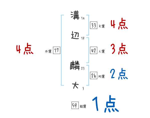 外運![]() | 溝辺麟大さんの外運は17画の4つ星!積極的な行動力。地位を気づき財産を手に入れる。純粋な心と直感力。 生活面を象徴する運勢です。外部から受ける影響力を表し、結婚運、家庭運や職場、環境への順応性を表します。 |