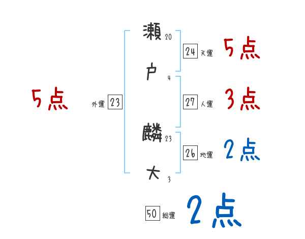 天運![]() | 瀬戸麟大さんの天運は24画の5つ星!家庭運が良く順調な人生。金運にも恵まれる。 家系が持つ宿命的な運勢を表します。祖先から受け継いだ苗字ですので自分の力が及びません。家柄を象徴します。 |
