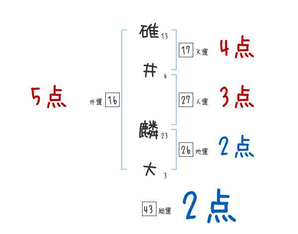総運![]() | 碓井麟大さんの総運は43画の2つ星!頑固な性格で独立心が強いかも。やや非現実的で浪費に注意しましょう。 あなたの人生を表す1番重要な運勢です。生涯を通じて影響する総合運となり、主に50歳以降の晩年期に影響を及ぼします。 |