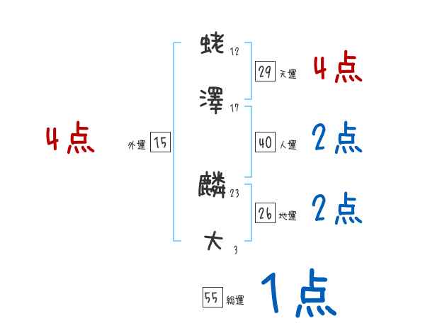 総運![]() | 蛯澤麟大さんの総運は55画の1つ星!欲張りな性格で軽率な行動に注意しましょう。病気に気をつけて。 あなたの人生を表す1番重要な運勢です。生涯を通じて影響する総合運となり、主に50歳以降の晩年期に影響を及ぼします。 |