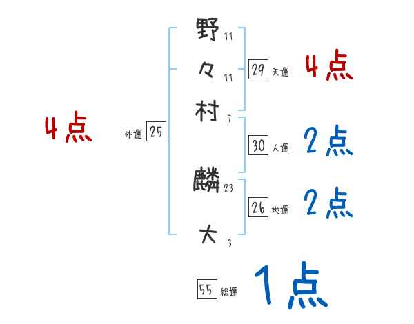 天運![]() | 野々村麟大さんの天運は29画の4つ星!完全主義で才能がある。厳格な心の持ち主。 家系が持つ宿命的な運勢を表します。祖先から受け継いだ苗字ですので自分の力が及びません。家柄を象徴します。 |