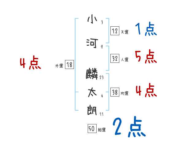 人運![]() | 小河麟太朗さんの人運は32画の5つ星!柔軟性があり成功する。チャンスが多く金運が良い。 性格や才能などを表す2番目に重要な運勢です。人間関係や協調性、社会的な成功に影響します。主に20歳から50歳ぐらいまでの中年期の運勢を表します。 |