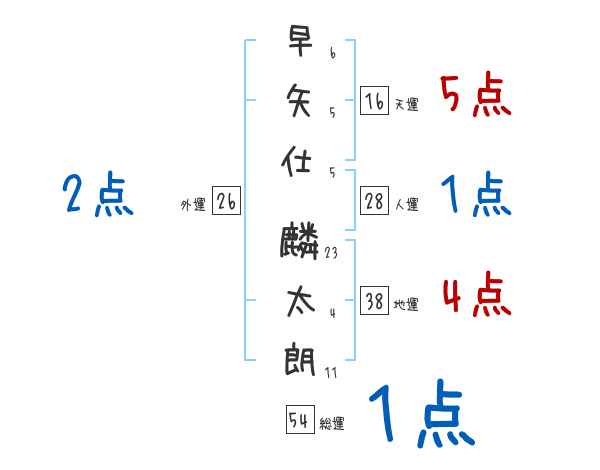 外運![]() | 早矢仕麟太朗さんの外運は26画の2つ星!波瀾万丈かも。信頼できる人を大事にしましょう。 生活面を象徴する運勢です。外部から受ける影響力を表し、結婚運、家庭運や職場、環境への順応性を表します。 |