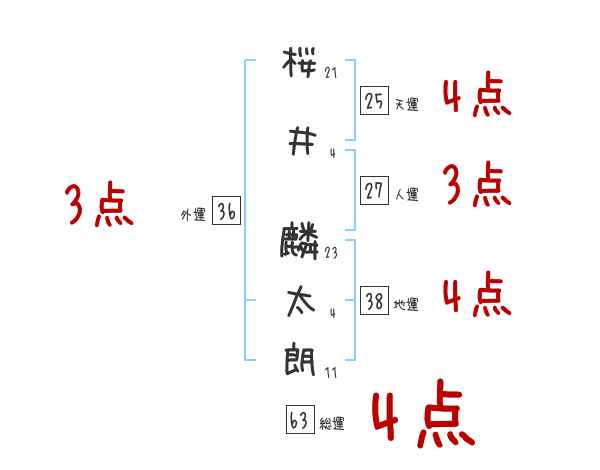 総運![]() | 桜井麟太朗さんの総運は63画の4つ星!家庭運がよく順調な生活。温和な性格。 あなたの人生を表す1番重要な運勢です。生涯を通じて影響する総合運となり、主に50歳以降の晩年期に影響を及ぼします。 |