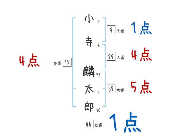 外運![]() | 小寺麟太郎さんの外運は17画の4つ星!積極的な行動力。地位を気づき財産を手に入れる。純粋な心と直感力。 生活面を象徴する運勢です。外部から受ける影響力を表し、結婚運、家庭運や職場、環境への順応性を表します。 |