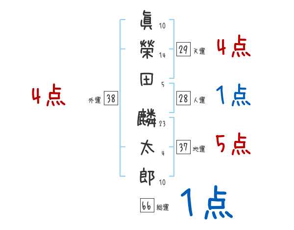 天運![]() | 眞榮田麟太郎さんの天運は29画の4つ星!完全主義で才能がある。厳格な心の持ち主。 家系が持つ宿命的な運勢を表します。祖先から受け継いだ苗字ですので自分の力が及びません。家柄を象徴します。 |
