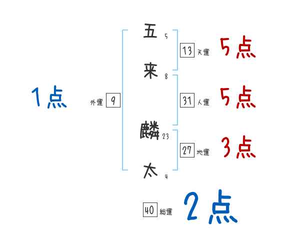 天運![]() | 五来麟太さんの天運は13画の5つ星!才能に恵まれ人気がある。名声を手に入れる。円満な人生。 家系が持つ宿命的な運勢を表します。祖先から受け継いだ苗字ですので自分の力が及びません。家柄を象徴します。 |