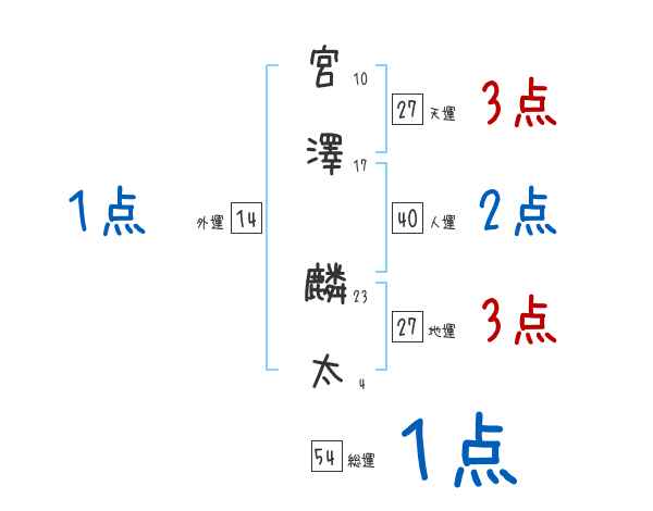 天運![]() | 宮澤麟太さんの天運は27画の3つ星!頭脳明晰だが強情で摩擦が多い傾向。孤立に注意。 家系が持つ宿命的な運勢を表します。祖先から受け継いだ苗字ですので自分の力が及びません。家柄を象徴します。 |