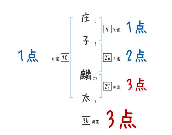 総運![]() | 庄子麟太さんの総運は36画の3つ星!先見性が豊かです。多少神経質で苦労することも。 あなたの人生を表す1番重要な運勢です。生涯を通じて影響する総合運となり、主に50歳以降の晩年期に影響を及ぼします。 |