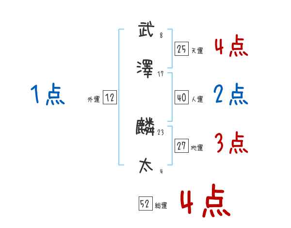 天運![]() | 武澤麟太さんの天運は25画の4つ星!個性があり才能があふれる。強運の持ち主で発展する。 家系が持つ宿命的な運勢を表します。祖先から受け継いだ苗字ですので自分の力が及びません。家柄を象徴します。 |
