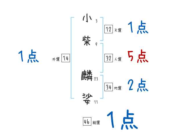 人運![]() | 小柴麟娑さんの人運は32画の5つ星!柔軟性があり成功する。チャンスが多く金運が良い。 性格や才能などを表す2番目に重要な運勢です。人間関係や協調性、社会的な成功に影響します。主に20歳から50歳ぐらいまでの中年期の運勢を表します。 |