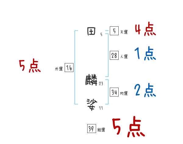 天運![]() | 田麟娑さんの天運は5画の4つ星!健康で安泰。協調性に優れ、財産に恵まれる。 家系が持つ宿命的な運勢を表します。祖先から受け継いだ苗字ですので自分の力が及びません。家柄を象徴します。 |
