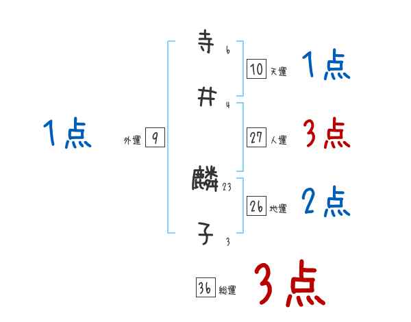 総運![]() | 寺井麟子さんの総運は36画の3つ星!先見性が豊かです。多少神経質で苦労することも。 あなたの人生を表す1番重要な運勢です。生涯を通じて影響する総合運となり、主に50歳以降の晩年期に影響を及ぼします。 |